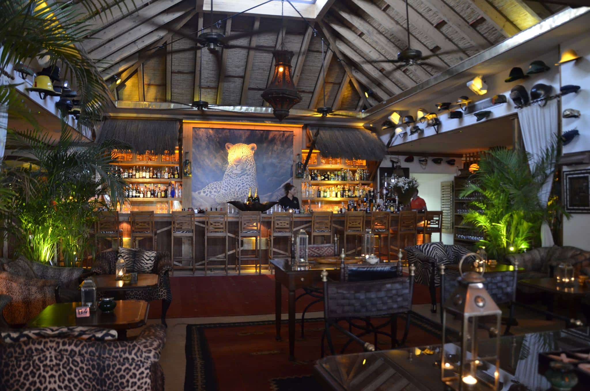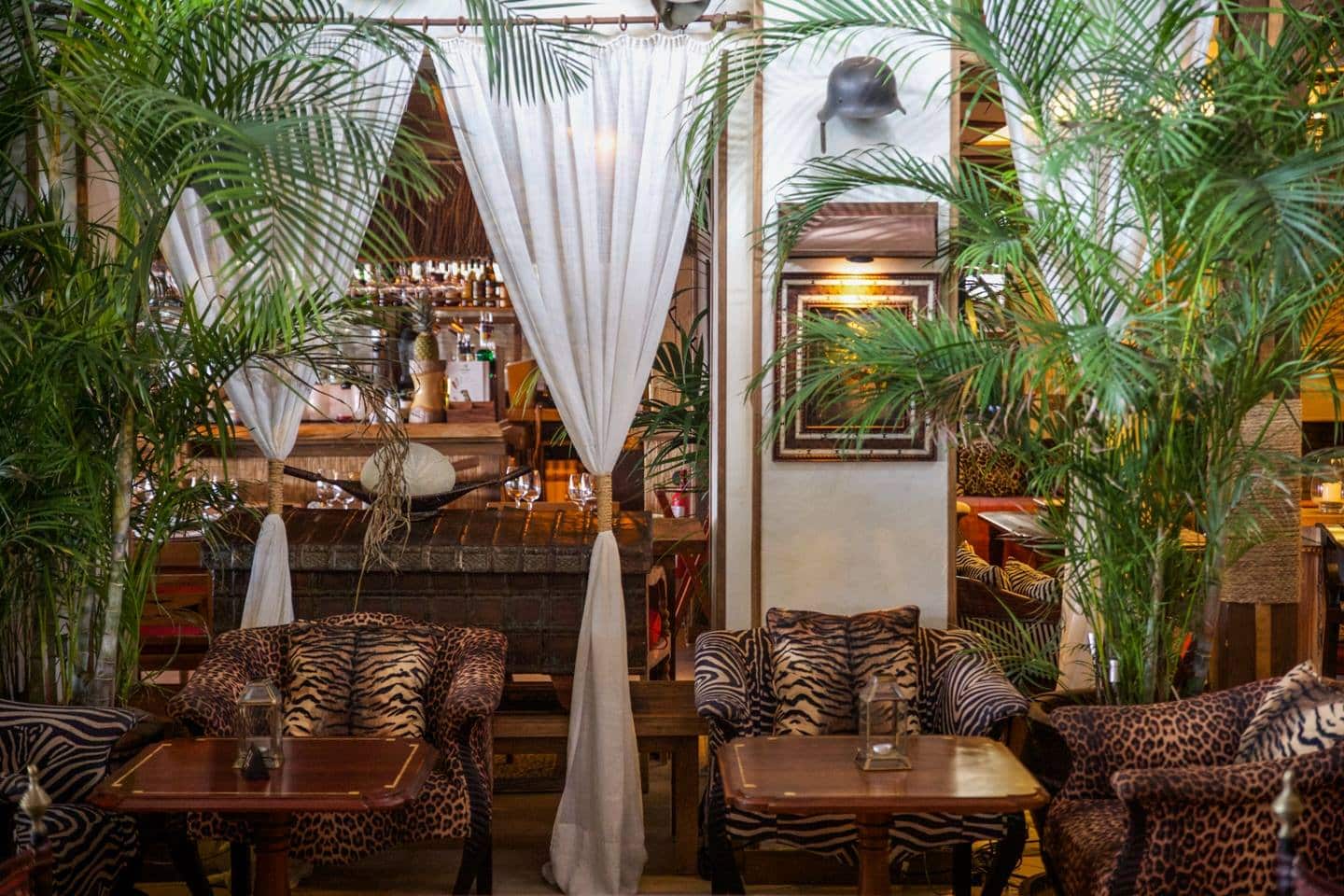 The interior of the restaurant is like a safari lodge, with animal prints, art, richly patterned rugs and a colonial style. It is cozy and comfortable with lots of different areas to choose from, to enjoy a coffee, a drink, lunch or dinner.